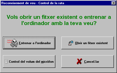 En aquest cas caldrà que us assabenteu quin dels problemes mencionats és el que falla i corregiu-lo. Fins que no estigui la tarja i el micro correctament instal·lat i que no hi hagi cap programa que la faci servir el programa no pot funcionar. Si l'ordinador tingués més d'una targeta no sé massa que pot passar. Aquest programa fa servir la que l'ordinador hagi configurat com a primera. Però suposo que no es donarà gaires casos que això passi. Suposant que no hi ha hagut aquesta dificultat i ha aparegut la paraula a reconèixer i l'ordinador l'ha detectat correctament, a continuació apareixerà un nou quadre: