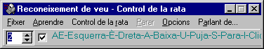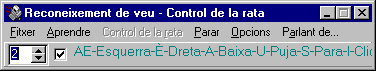 L'únic canvi visible és que l'opció parar s'ha desactivat, color gris, i l'opció Control de la rata s'ha activat. En aquest moments per molt que cridem el programa no s’escolta. Si volem que ens torni a fer cas, clicarem a l'opció Control de la rata i tornarà a començar el reconeixement i interpretació d'ordres. Quan no funciona el reconeixement veureu que el menú Guardar com... està activat, aquesta és l'opció que farem servir si els patrons de reconeixement són prou bons i volem guardar-los per una altra ocasió i no volem fer el reconeixement. Si fem que el reconeixement estigui actiu, opció Control de la rata, podrem fer les nostres primeres experiències de reconeixement automàtic de la veu amb interpretació d'ordres amb el programa del qual estem parlant. Si dieu els sons, AE, È, U, A, I, S, R, É, veureu si el programa us fa cas. És possible que al principi no us cregui gaire, si no es mou cap allà on voleu mireu al títol de la finestra i mireu quins són els sons que detecta. Menú opcions