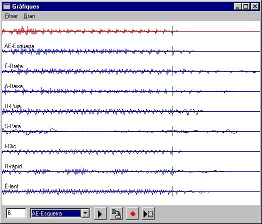 Aquí tindreu el so que s'ha gravat per fer el reconeixement. Si veieu alguna gràfica de funció que es vegi molt poc potser no s'ha gravat res. Clicant a l'últim botó podrem escoltar tots els sons gravats per si realment hem dit i s'ha gravat el que pensem que hem dit i gravat. Amb el primer botó podem escoltar cadascun dels sons, independentment dels altres, triant-lo en el quadre d'elecció on ara apareix la llegenda AE-Esquerra. Si algun so estigués mal gravat podem tornar a fer l'entrenament per aquest últim so clicant en el botó de color vermell que ens farà aparèixer un dels quadres descrits anteriorment i que en aquest cas seria:
