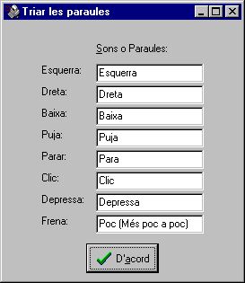 Cliquem a No, en lloc de fer el reconeixement per sons ho farà per paraules i prèviament se'ns ofereix un quadre on podem canviar les paraules. Per si parlem un altre idioma o volem provar-ho amb altres paraules que ens sembli milloraran el reconeixement. Aquí recordem que en realitat el programa no distingeix tota la paraula sinó només les 4 primeres dècimes de segon. O sigui el reconeixement serà millor com més diferents siguin les 4 primeres dècimes de segon de les paraules.