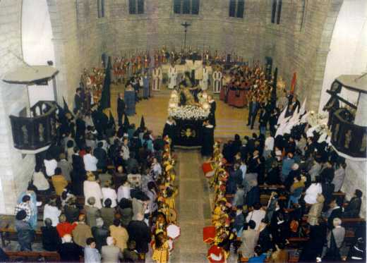 Els manaies de Banyoles acompanyant el pas de la Mare de Déu dels Dolors, al final de la processó, a l'esglèsia parroquial de Santa Maria dels Turers.