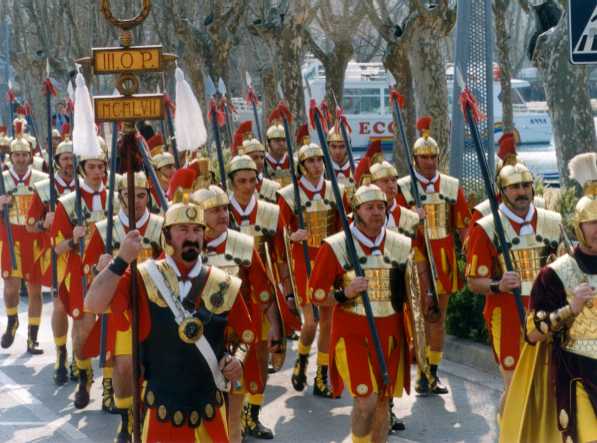 Els manaies, doncs, no formaven part d'una confraria exclusiva durant els segles XVIII i XIX, al revés del que succeeix avui. El seu número oscil·lava entre una vintena i una quarantena; vestien aleshores cuirassa i casc amb cimera, una capa que era vermella per la processó del Dijous i blava per la del Divendres i, a més, feréstegues barbes postisses per amagar la seva identitat. Colpejaven a terra amb la llança, característica que s'ha mantingut fins avui, i probablement realitzaven ja la tradicional figura de l'"estrella". A més d'encapçalar les dues processons, anaven a buscar els pendonistes respectius, i fins i tot havien arribat a participar en les funcions religioses de la Catedral fins que el bisbe ho prohibí el 1851. S'acompanyaven amb música de flautes i tabals per a la marxa lenta, i una cobla els acompanyà per als desplaçaments ràpids fins a mitjan s. XIX, quan sembla que s'amplià el nombre de flabiols i es composà, potser, el que avui és la "marxa ràpida". El que coneixem com a "marxa lenta" es composà segurament a finals del s. XVIII, sense que quedi clar quin és l'origen d'aquesta antiga melodia.