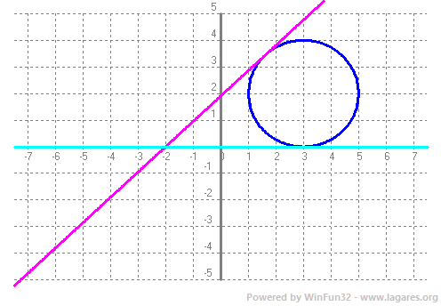 El centre de la circumferčncia és `(3,2)` i el radi `2`. Per la qual cosa volem trobar les equacions de les rectes que passen per `(-2,0)` i la distŕncia al centre val 2. `y-0=m(x+2) => y=mx+2m => mx-y+2m=0`. Aplicant la fórmula de la distŕncia d'un punt a una recta: