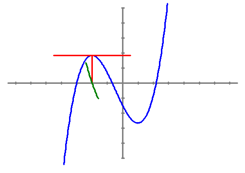 La funció derivada a la vora del màxim, és la gràfica de color verd, veiem que és decreixent. Per la qual cosa la derivada de la derivada, la segona derivada, és negativa. Si f'(x) = 0 i f''(x) < 0 en (x, f(x)) hi ha un màxim En un punt on la funció sigui derivable i hi ha un mínim, la derivada val 0.