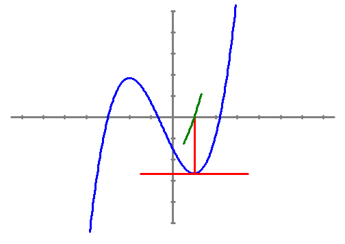 La funció derivada a la vora del mínim, és la gràfica de color verd, veiem que és creixent. Per la qual cosa la derivada de la derivada, la segona derivada, és positiva. Si f'(x) = 0 i f''(x) > 0 en (x, f(x)) hi ha un mínim |