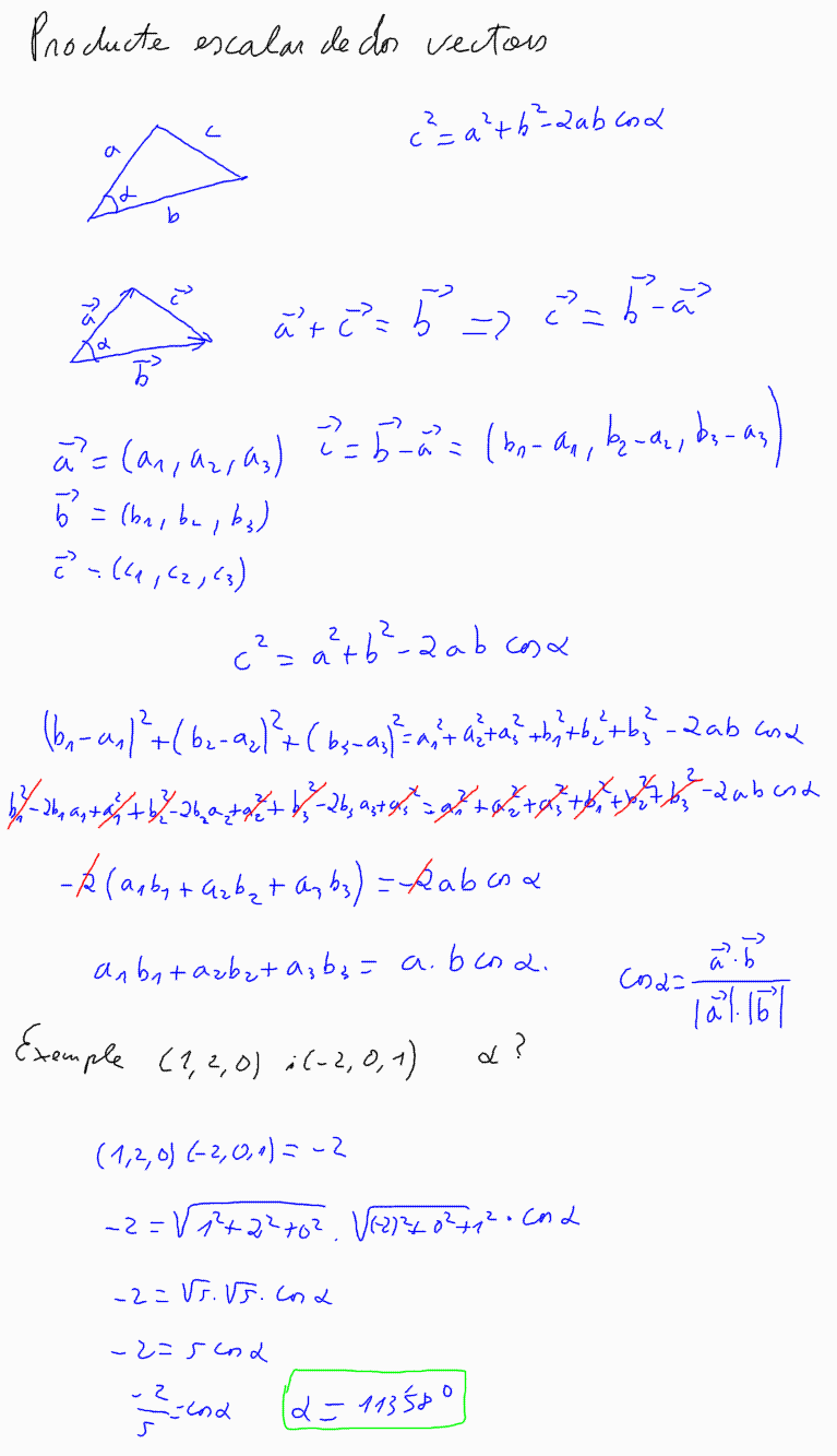 Projecció d'un vector sobre un altre. Angle entre dos vectors. Dos vectors són perpendiculars si el seu producte escalar val 0.