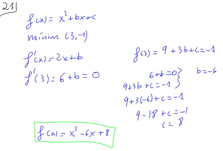 4-La gràfica de la funció f(x) = x2 +bx + c té un mínim ene l punt (3, -1). Calcula b i c.