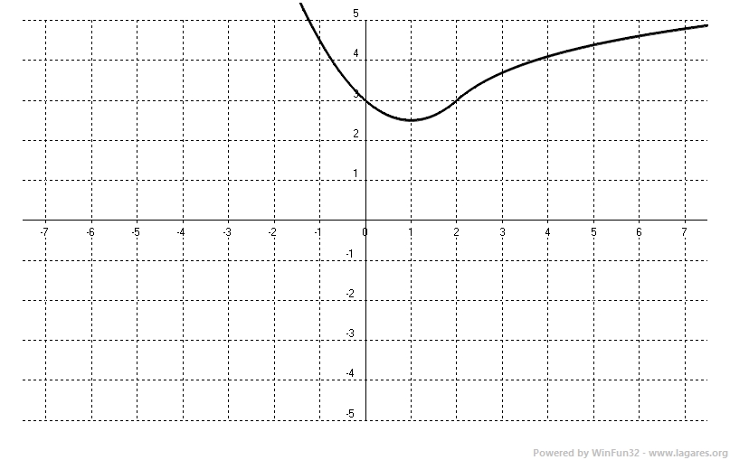 Sigui la funció derivada d’una funció derivable` f(x)` que passa pel punt `A = (0, 3)`. $$ f'(x)=\begin{cases} x-1 \text{, si } x\le2\\ \\ \frac{1}{x-1} \text{, si } x>2\end{cases} $$ a) Calculeu la funció `f(x)`. [1,5 punts] Solució: