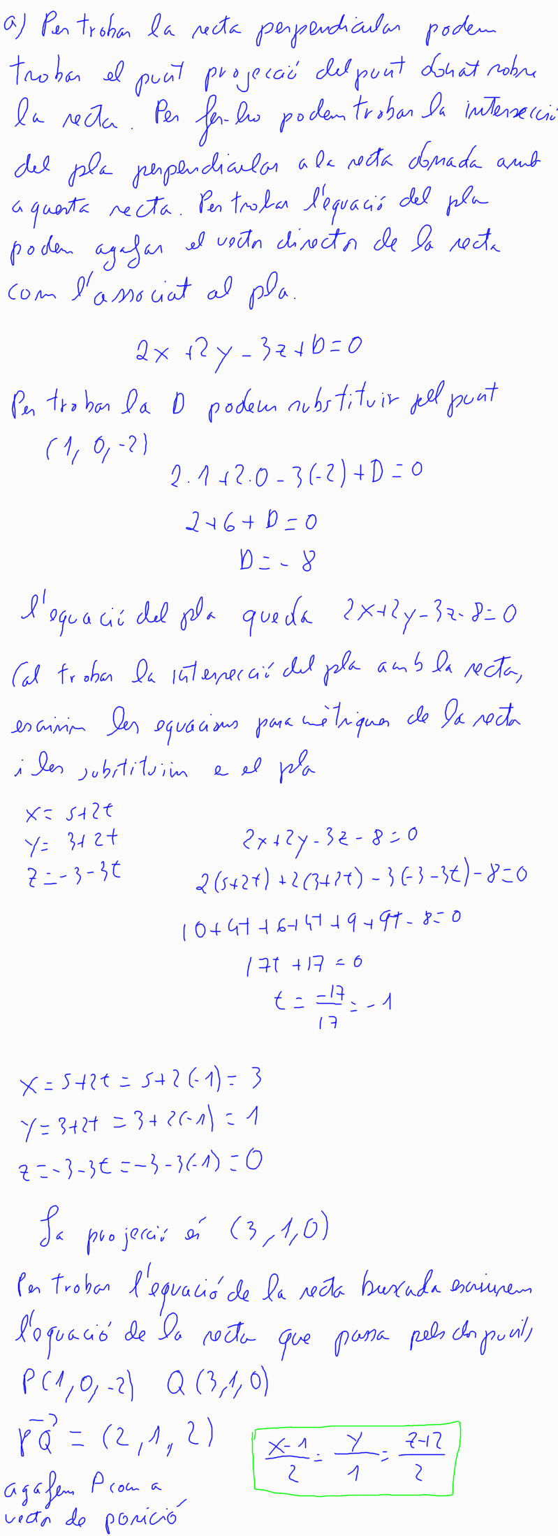 10. (2010-juny-5) 2. Donats el punt P = (1, 0, -2) i la recta a) Trobeu l'equació contínua de la recta que passa pel punt P i talla perpendicularment la recta r. b) Calculeu la distància del punt P a la recta r. [1,5 punts per l'apartat a; 0,5 punts per l'apartat b] |