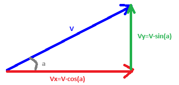 Distància recorreguda per una bala de canóQuan disparem un canó amb un cert angle, `a` i una velocitat, `\vec{V}` amb mòdul `V`, podem descomposar la seva velocitat en dues components, l'horitzontal i la vertical. ![]() Galileu va descobrir que l'espai recorregut per una cosa que cau és: `e(t)=-1/2 g t^2+v_ot+e_0` sient: