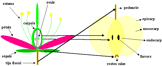 QUÈ ÉS EL FRUIT?La definició botànica de fruit no s'avén amb el sentit vulgar del mot, com tan sovint ocorre quan els saberuts han volgut delimitar i precisar termes emprats pel poble des de temps remotíssims. En Pius Font i Quer com a botànic rellevant defineix en un dels seus llibres més representatius, " Iniciació a la botànica", el fruit com: "Ovari amb els primordis seminals fecundats (megaesporangi) i convertits en sements o llavors. A partir de la pol·linització de la flor els carpels ja completament formats i amb els estigmes en disposició de rebre pol·len, inicien una nova etapa de desenvolupament, creixen, modifiquen la seva forma, s'endureixen o es tornen carnosos, i a poc a poc arriben a transformar-se en un fruit madur." El fruit és una estructura complexa formada per una envolta procedent del desenvolupament dels carpels, unes llavors procedents del desenvolupament dels òvuls fecundats i, de vegades, altres estructures com ara el receptacle floral que poden haver-se desenvolupat fins englobar la resta. ![]() |