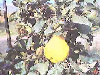 | Fulla: Aovada o arrodonida, amb les vores senceres. Curtament peciolades, alternes i amb tendència a caure, són de color verd per l'anvers i blanques pel revers. Flor: Solitaries, grans, subsentades i terminals. Són blanques o rosades, mesuren de 4 a 5 cm. de diàmetre i presenten 5 grans pètals i 20 estams. Fruit: Es globós o piriforme, amb un melic apical, en el que hi va la coroneta formada pel calze. Està cobert de la mateixa borra que les branquetes, la qual es desprèn al fregar-los. El seu sabor és molt aspre per a la quantitat de tanins que conté. És aromàtic i groc en la maduresa. |