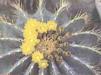 | Descripció: Cactus de forma esfèrica, una mica aplanada i verda, coberta d'afilades espines grogues, de creixement més aviat lent. La seva alçada és aproximadament d'1m. |