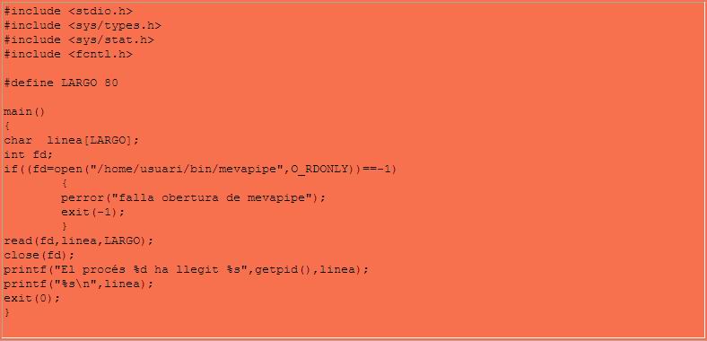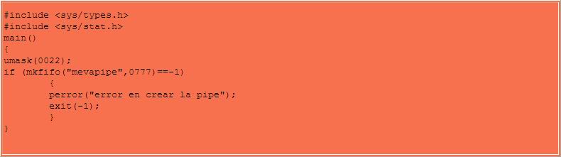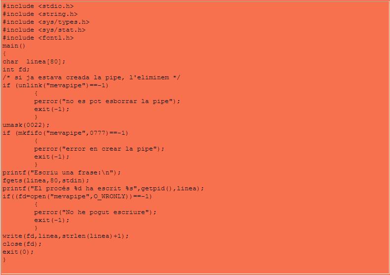 Com es pot veure, hem utilitzat la funció umask per assegurar-nos el valor de la màscara i que el resultat final, pel que fa a permisos, sigui 755. SINCRONITZACIÓ El sistema operatiu és l'encargat de proporcionar la sincronització ja que quan un procés obri (crida open) una pipe amb nom per a llegir o per a escriure, quedarà aturat, bloquejat, fins que un altre procés també l'obri per a l'operació contrària. Per il·lustrar això, crearem un programa que escrigui una frase que rep pel teclat en una pipe amb nom (pipe3.c) i un altre programa que el llegeixi i el mostri per pantalla (pipe4.c). El codi de pipe3.c serà: