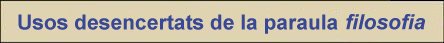 Usos desencertats de la paraula filosofia Sovint, i especialment en els mitjans de comunicació, es fa un mal ús o un abús de la paraula filosofia. Certament, no és fàcil caracteritzar o dir en què consisteix la filosofia; sí, però, és fàcil definir en què no consisteix: la paraula filosofia no vol dir tàctica, estratègia, línea d’actuació, objectiu, estil o procediment. Aclariments sobre què és la filosofia els podem trobar a Filòpolis, en les unitats Filosofia: un constant pas del mite al logos i també Filosofia? Sí, gràcies. Explorem ara casos d’usos desencertats i públics de la paraula. Sembla que si hom no troba la paraula adient en determinades situacions, sigui per limitacions lingüístiques o sigui per negligència, deixar anar filosofia pot funcionar; doncs, no! El mal ús o l’abús de les paraules, les desvirtua! Presentadors de programes televisius, tertulians televisius o radiofònics, molts periodistes esportius... fent un mal ús o abús de la paraula filosofia, propagant la pèrdua de la riquesa conceptual de les paraules. Certament, no han d’exercir d’educadors, però tampoc com a mestres de la distorsió lingüística. |